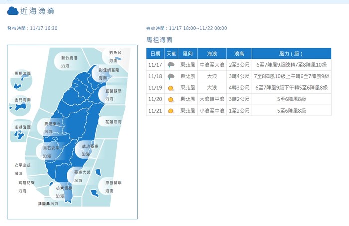 【福州市气象局】两马航线:今天15-16时,平均风:4.2米/秒(3级);极大风:8.1米/秒(5级)。18日,东北风7~8级,阵风9级;天气阴,气温13~19℃;能见度3.0~7.0千米。19日,东北风6~7级,阵风8级;天气阴转多云,气温10~15℃;能见度5.0~9.0千米。20日,东北风5~6级,阵风7~8级;天气晴,气温10~17℃;能见度3.0~4.0千米。11月17日16时发布。