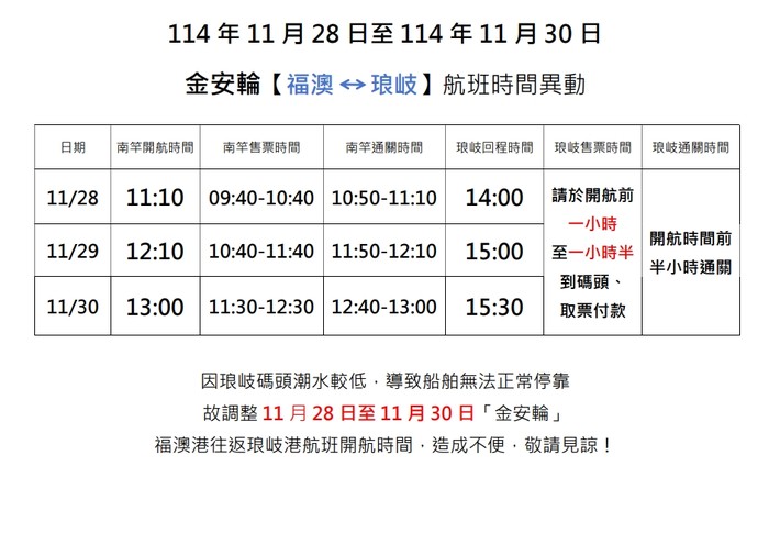為確保航行安全與旅客搭乘順利,特調整此期間的航班時間。