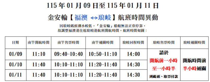 【航班時間調整公告】 日期:115 年 01 月 09 日 ~ 115 年 01 月 11 日 航線:馬祖福澳 ↔ 琅岐(小三通航線) 因琅岐港潮水較低,為優先考量航程安全並確保旅客搭乘順利,原定航班時間將進行調整。 注意事項: 琅岐回程旅客請提早 1 小時至 1.5 小時到碼頭購票 建議提前完成購票與通關手續,以免延誤行程 造成不便,敬請見諒!! 聯絡我們 如有任何問題,歡迎透過官方 LINE 聯繫: 南北海運股份有限公司 敬啟 電話:0836-25151 傳真:0836-22716