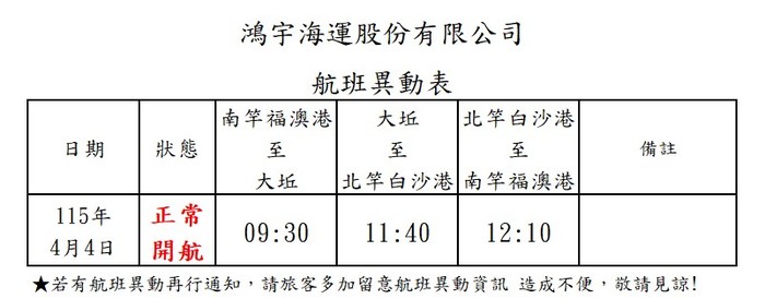 本公司經營南竿→大坵→北竿→南竿固定航線, 依交通部航港局訂定之開停航標準並依據交通部中央氣象署公告之數據,可正常開航~ 歡迎欲前往大坵賞鹿的旅客可於線上訂位或現場臨櫃購票喔~ 線上訂位請點→馬祖海上交通訂位購票系統 如有任何問題也可加入「鴻宇海運」官方LINE ID:@526joboi,詢問我們喔~ 鴻宇海運感謝您,祝您旅途愉快,平安順心! 鴻宇海運股份有限公司 敬啟 服務電話:0836-23255