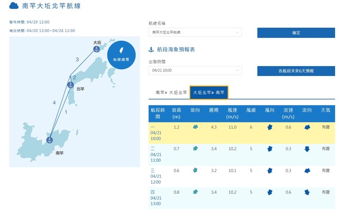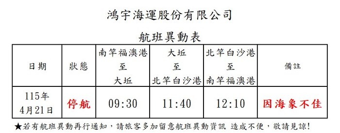 且因風大及浪高致船舶無法安全停靠,為旅客之安全,4月21日上午09:30 大坵航班停航,航班異動如上表,造成不便,敬請見諒,謝謝!