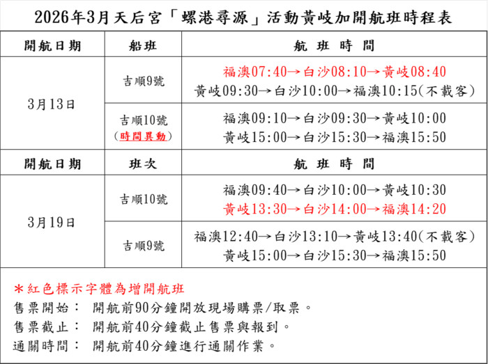 於活動期間增開「黃岐小三通」加班船,並為配合活動順利進行及整體航班調度安排,
