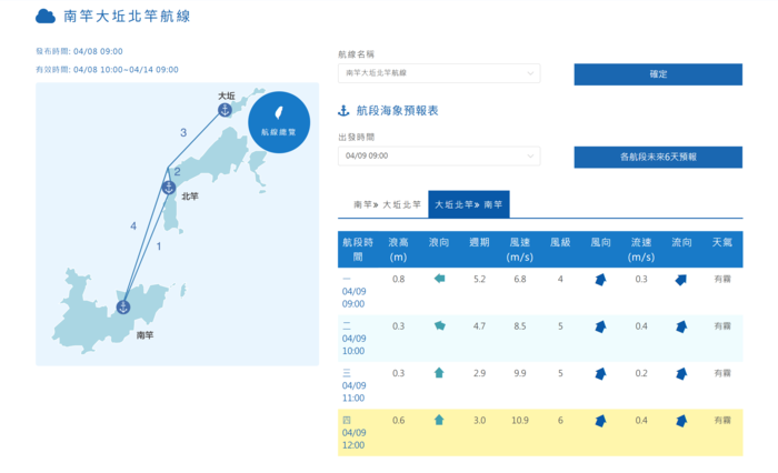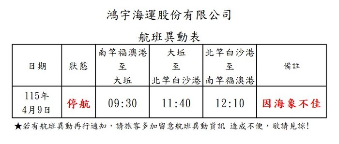 為考量航行及旅客之安全,4月9日上午09:30 大坵航班停航,航班異動如上表,造成不便,敬請見諒,謝謝!